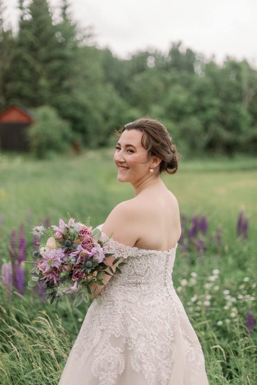 I juni när Tirra fick sin Johan på Gyllene Brunnen gick blommorna i lavendel, champagne och blått. Brudparet önskade en rund och vild bukett med ängskänsla med blommor som rosor, klematis, lavendel, eryngium, nigella, lövkoja och olika grönt. Johan bar en matchande corsage och Tirras tärnor bar en varsin matchande bukett.
